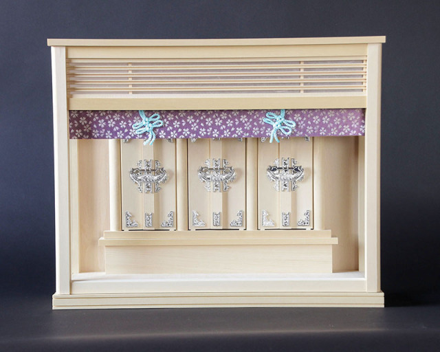 神棚 箱宮セット「つぼみ」のご紹介。薄型の箱宮で狭いお部屋にもお祀りしやすい神棚です。桜模様の玉虫織生地とばり(付属品)と白金色の飾り細工を使用した繊細で爽やかな雰囲気のお宮です。